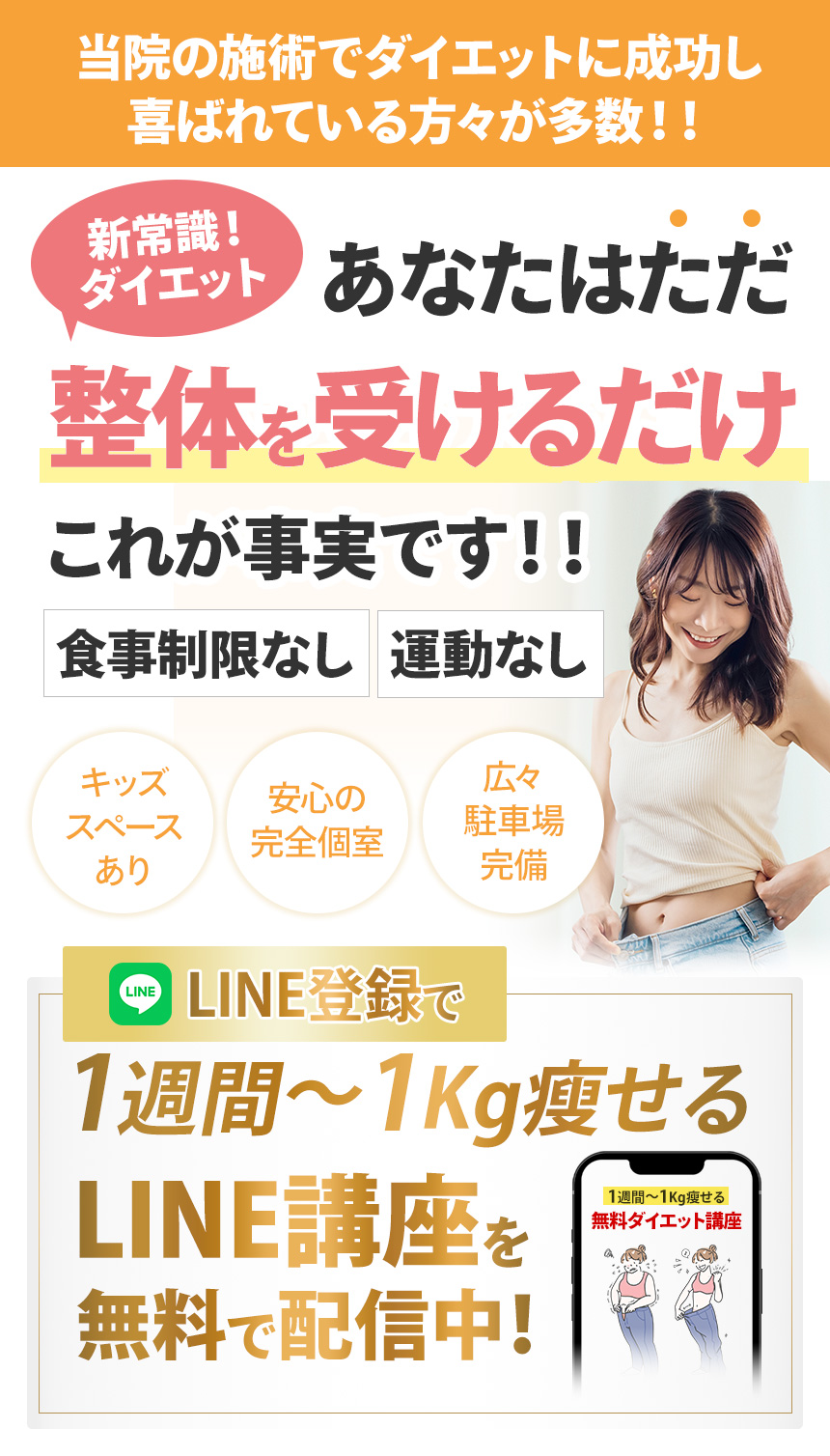 ダイエット施術を受けたいけど、お子様を預ける事ができないといわれる方も多数来院中!キッズスペースとベビーベッドを完備しております!さらに子育て経験豊富なスタッフが多く安心して施術を受ける事が出来ますので、気軽にご来院いただけます。