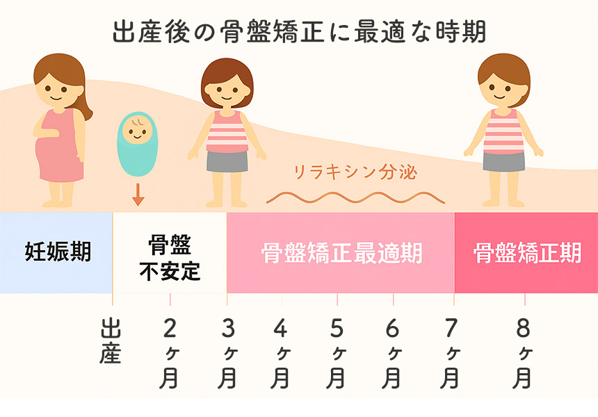なので正しい位置に戻す時期は産後1ヶ月頃が最適と言われており、骨盤矯正適応時期は、出産後約24ヶ月がおおまかな目安となっております。高い効果を得るには、出来るだけ早めの矯正をお勧めいたします。
